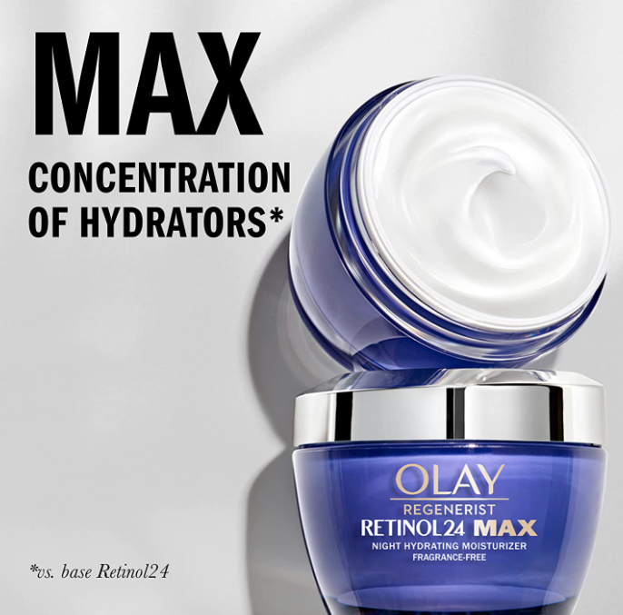 This Olay Regenerist Retinol 24 Max Moisturizer allows your Retinol 24 Max moisturizer to penetrate the surface of your skin overnight for a skin transformation. We've packed this fragrance-free formula with Retinol 24 maximum concentration of humectant to leave you feeling hydrated and replenished. Our Retinol 24 formula is now in its largest form, the Retinol 24 Hydrating Complex, to visibly smooth wrinkles and even out skin tone. After cleansing, massage the face and neck at night to awaken radiant skin. This formula contains no fragrance, phthalates, mineral oil or synthetic dyes. Are you ready to maximize your skincare routine? Also includes a 1-week sample of our Regenerist Whip Facial Moisturizer. This fragrance-free whipping moisturizer absorbs instantly, leaving your skin feeling soft, smooth and non-greasy. Vs. Base Retinol24