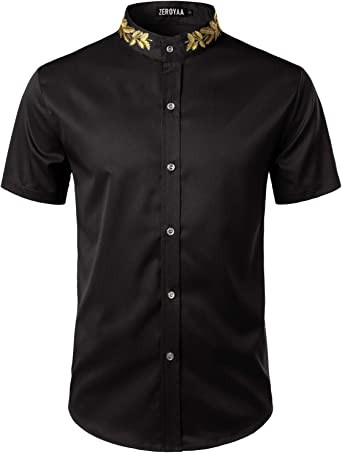 ZEROYAA Men's Trendy Gold Embroidered Cheongsam Collar Slim Short Sleeve Casual Dress Shirt, Gold